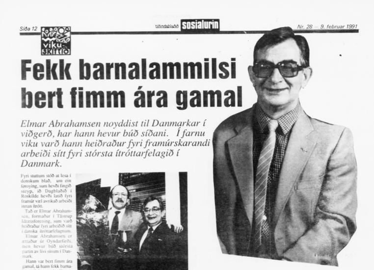 Mynd: Sosialurin skrivaði um Elmar Abrahamsen tann 9. februar 1991, tá hann var heiðraður fyri sítt stóra arbeiði í Taastrup Idrætsforening
